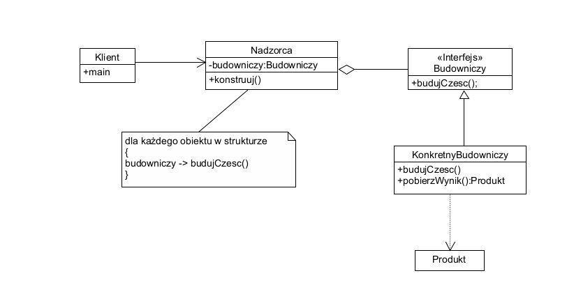 Wzorzec kreacyjny używany w przypadku klas z wieloma potencjalnymi konstruktorami i zmiennymi. Ułatwia tworzenie nowych obiektów poprzez wywoływanie setterów klasy Budowniczy, zamiast wypisywania zmiennych w konstruktorze, co może być problematyczne w przypadku klas z wieloma zmiennymi, których niekoniecznie chcemy wszystkich użyć.